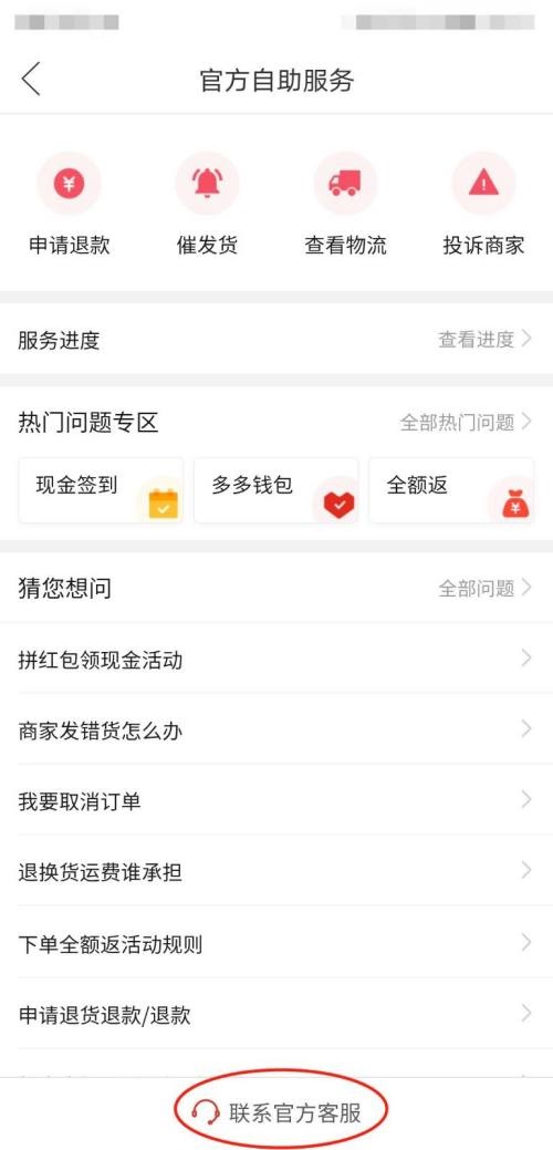 第四步:进入官方自助服务界面后,在拼多多官方自助服务界面底部,选择“联系官方客服”,进入拼多多官方客服对话框(如图所示)。
