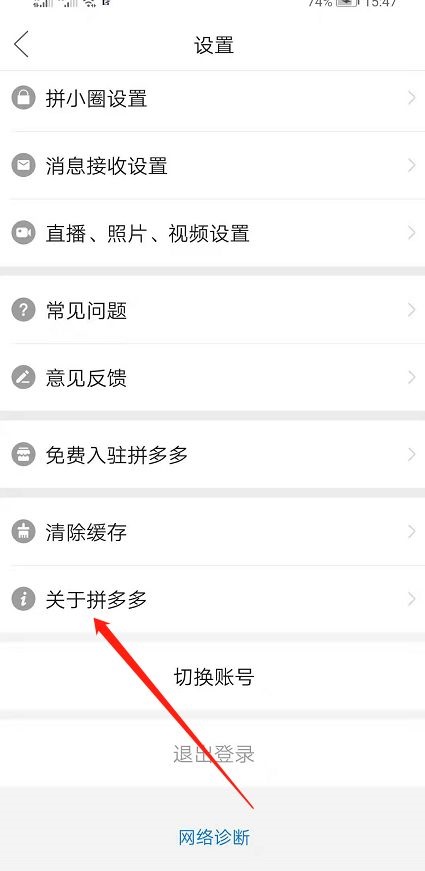 第四步:然后我们在设置界面,点击【关于拼多多】(如图所示)。
