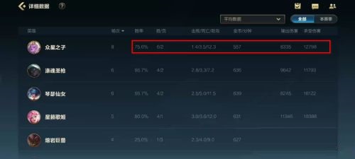 3.最后在详细资料界面可以看到胜率、胜负、战绩、输出和承受伤害都会影响英雄评分计算。