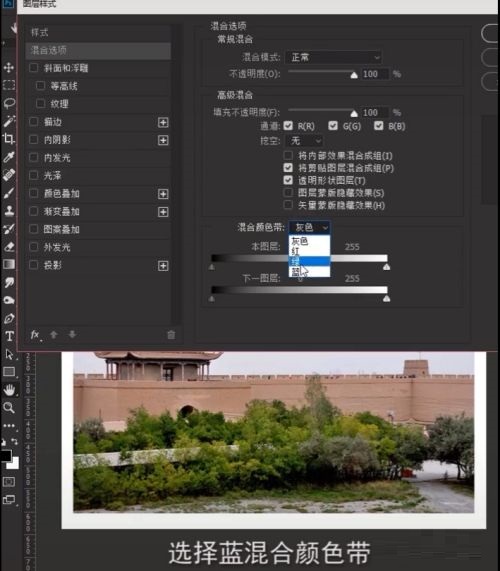 第六步:图层样式——选择蓝混合颜色带(如图所示)。