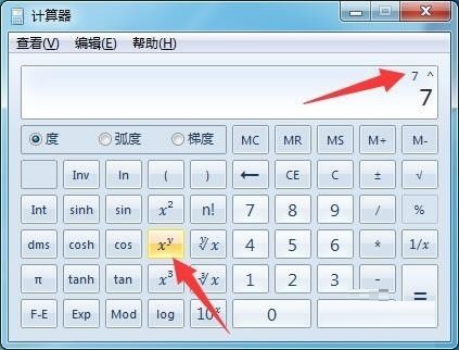 第四步:接下来点击左侧的xy按钮,在右上方计算窗口处显示出7^(如图所示)。