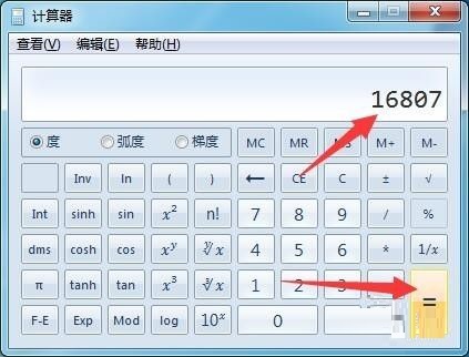 第五步:再点击数字5,代表5次方,右上方的计算窗口显示出7^5,最后点击等于号,计算窗口就显示出了答案(如图所示)。