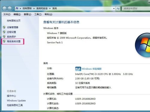 第一步:首先我们在“计算机”上点右键,点“属性”,打开计算机的系统窗口。然后点击左侧的“高级系统设置”,打开系统属性(如图所示)。