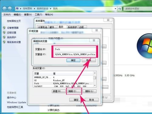 第四步:点击“编辑”按钮,对系统变量Path进行编辑,在变量值的最前面加上“%JAVA_HOME%bin;%JAVA_HOME%jrebin”(如图所示)。
