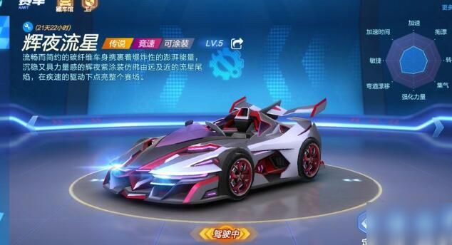 辉夜流星是手游原创车型的正统血脉。高速行驶时车身在紫光明暗间跃动,寒芒出鞘,夜凝星辉!