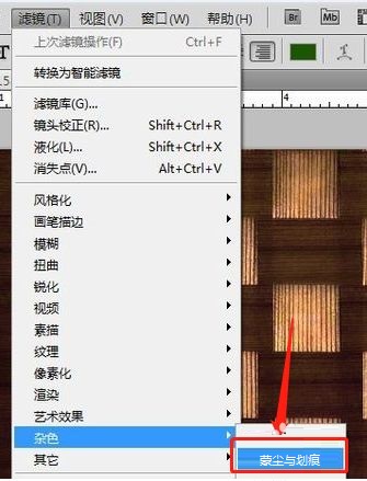 第一步:首先是在软件中打开滤镜菜单栏中的杂色选项,之后我们要用鼠标在里面中选择蒙尘与划痕选项(如图所示)。
