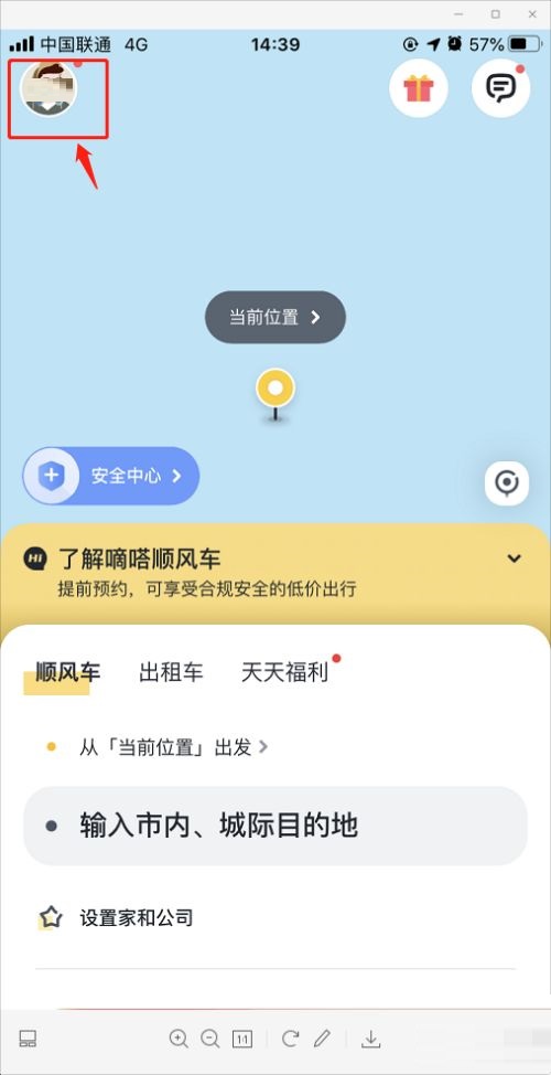 第一步:首先我们打开手机上的嘀嗒出行APP,进入嘀嗒出行主页,点击个人头像,跳转页面(如图所示)。