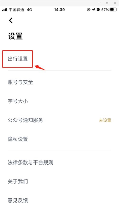 第三步:进入设置页面,选择出行设置(如图所示)。