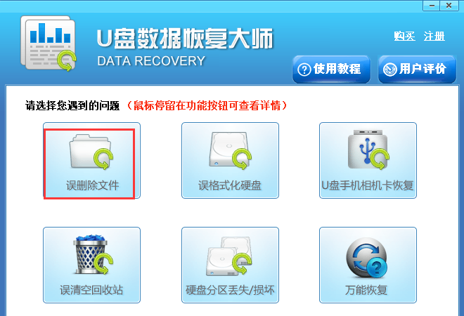第一步:首先我们打开U盘数据恢复大师软件,然后在界面中点击“误删除文件”选项,进入下一步(如图所示)。
