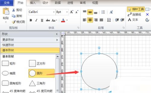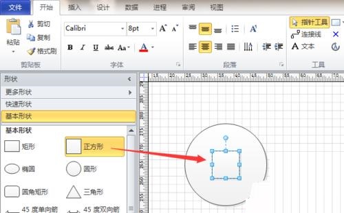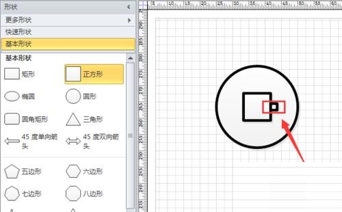 第二步:接着,从左侧形状栏中将“圆形”和“正方形”两个形状拖入编辑区域,并调整两个图形的大小,如图所示。