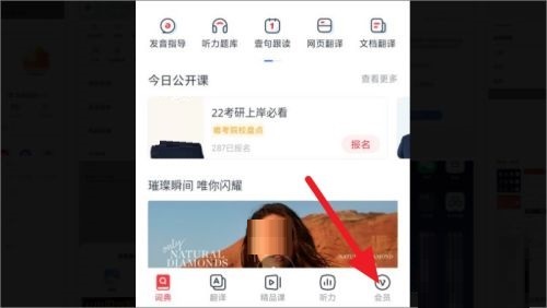 第一步:首先打开有道词典,打开后点击底部的【会员】(如图所示)。