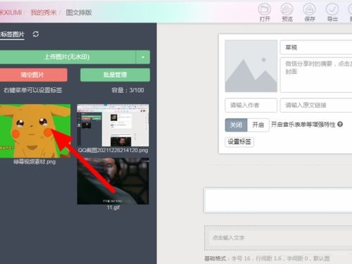 第二步:在排版页面,点击图片,完成图片添加(如图所示)。