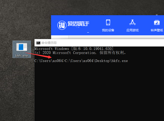 (2)打开电脑“命令提示符”工具,将桌面上已经下载好的 bkfc 工具用鼠标拖到“命令提示符”界面当中,会自动填入工具所在路径: