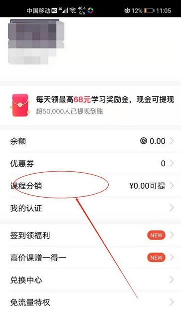 第二步:在我的页面点击“课程分销”(如图所示)。