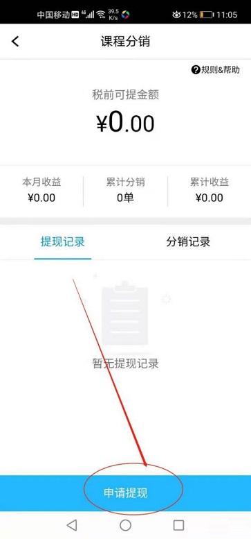 第三步:进入课程分销页面,点击“申请提现”(如图所示)。