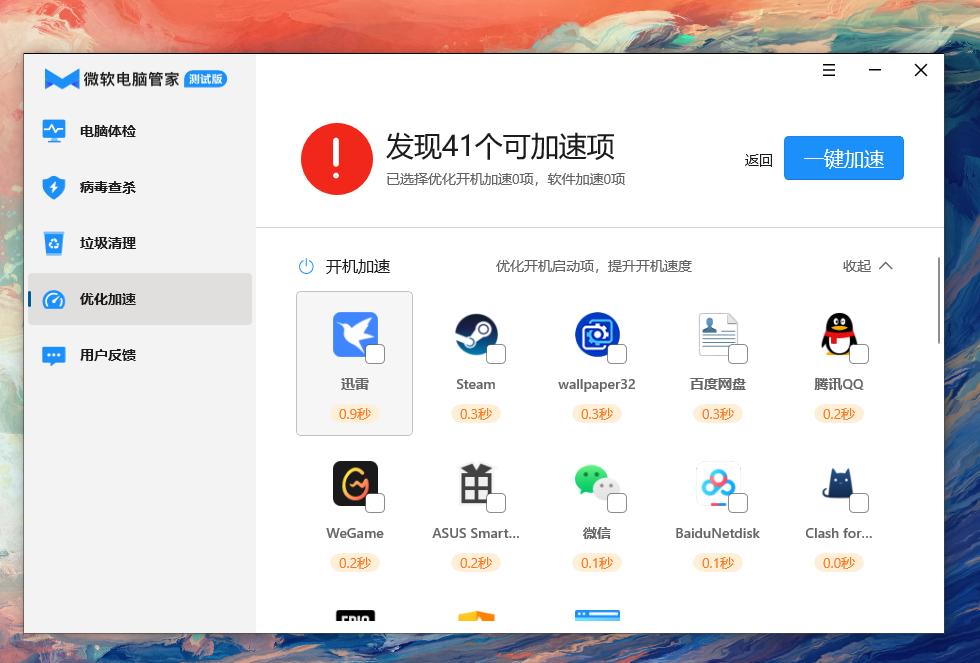 至于这个加速优化功能,它会显示开启的启动和正在运行的程序占用了你多少内存,大家可以进行一个勾选,把不需要的软件关闭。