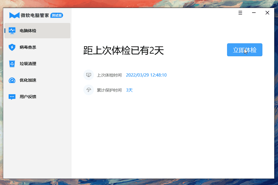这个微软电脑管家给小编的的第一印象就是:界面非常干净简洁,并且占用的空间也很小,只有 86MB 左右。
