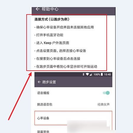 第二步:进入跑步设置页面,点击【心率设备】将软件与相关的设备进行连接(如图所示)。