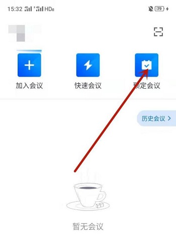 第三步:在腾讯会议的首页界面的三个功能中选择“预定会议”,点击进入(如图所示)。