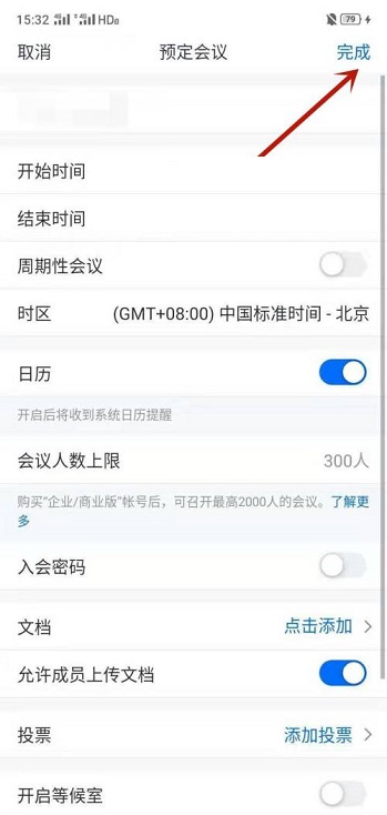 第五步:在会议设置界面设置时间,投票等,选择右上角的“完成”,就可以成功预定会议了(如图所示)。