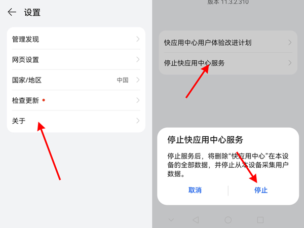 第三步:点击关于,点击停止快应用中心服务,点击停止即可(如图所示)。