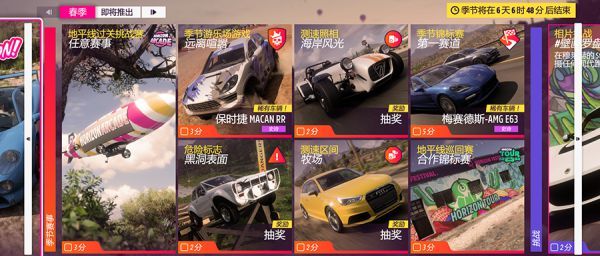 有点类似地平线4的嘉年华挑战,会不时在地图中更新,挑战内容包括漂移、竞速等等,大家可以选择擅长的项目参与。