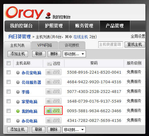 被控端搞定了,使用帐号和密码登录Oray官网。依次打开【我的控制台】-【产品管理】-【向日葵管理】,在向日葵管理中心中,我们便可以看到刚刚在线的远程主机了。