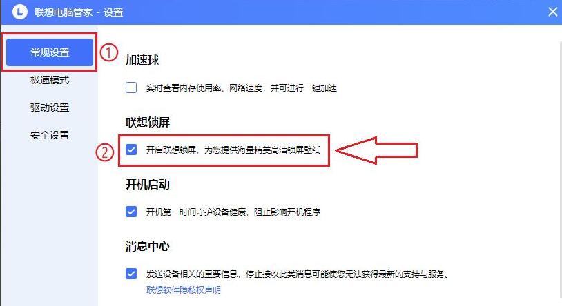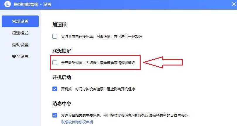 随后,点击【常规设置】,找到“联想锁屏”选项栏;取消勾选【开启联想锁屏,为您提供海量精美高清锁屏壁纸】。