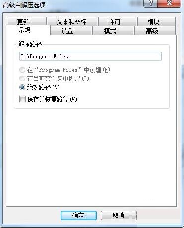 接着,点击“高级”选项卡,点击“自解压选项”,在解压路径编辑框中填入"C:Program