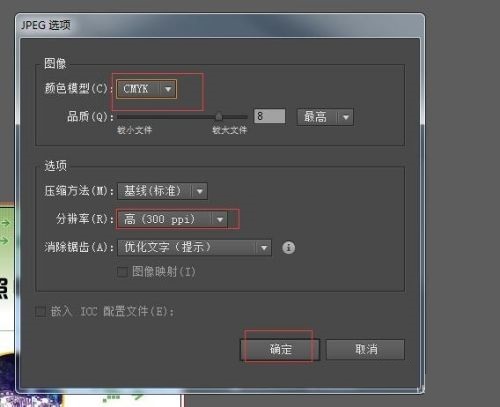 第七步:在弹出的对话框中,色彩模式选择“CMYK”,分辨率选择为300,然后单击确定就可以了(如图所示)。