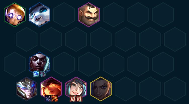 后期变阵4-5拉八,大搜找希维尔、布隆和刀妹三张四费卡,先保证4极客4强袭2保镖的基础阵容,再根据场上情况决定是否继续搜整体二星质量还是直接上九找金克丝,一般来说二星希维尔足够锁血上九。