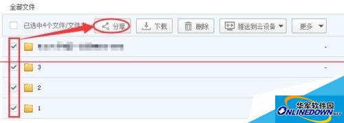 4、点击网盘后就进入了网盘页面,我们就能见到自己在网盘的中所有资源,在想要和好友分享的资源前打钩, 然后再点击上方的“分享”。