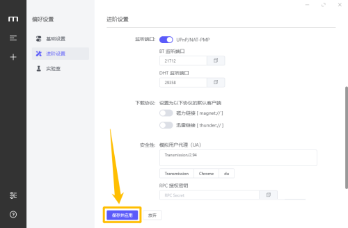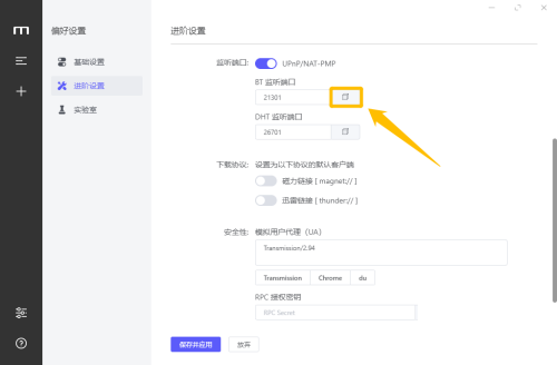 第六步:开启BT和DHT监听端口后,点击下方的“保存并应用”按钮,这样就可以成功开启BT和DHT监听端口了。