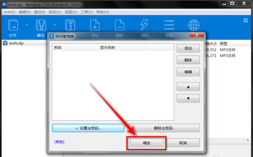 第六步:返回“密码管理器”窗口,点击“确定”按钮,再重启Bandizip即可。