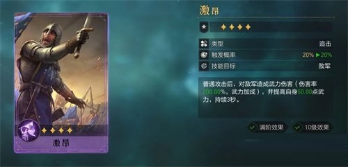 非常契合名字的技能2号(两只狗头),谋略准备型技能,毁灭的预示的下位替代,虽然卡面上的伤害率差距较大,毁灭高了95%。但伏击升星简单,满星后触发概率能到25%,此时再去对标白板毁灭差距就缩小了很多,阳谋和万里平戎策也是同理。