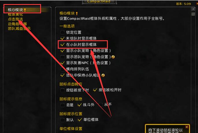 第三步:然后在【核心模块】中,将【在小队时显示框体】,取消勾选,就能进行设置了。