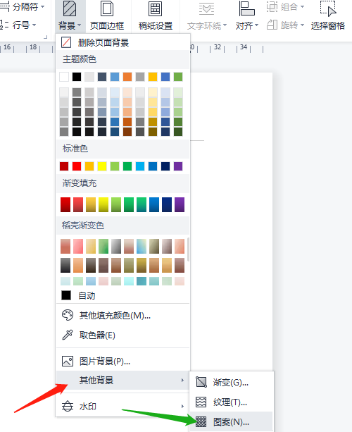 第四步:单击页面布局菜单,背景,其他背景,图案。