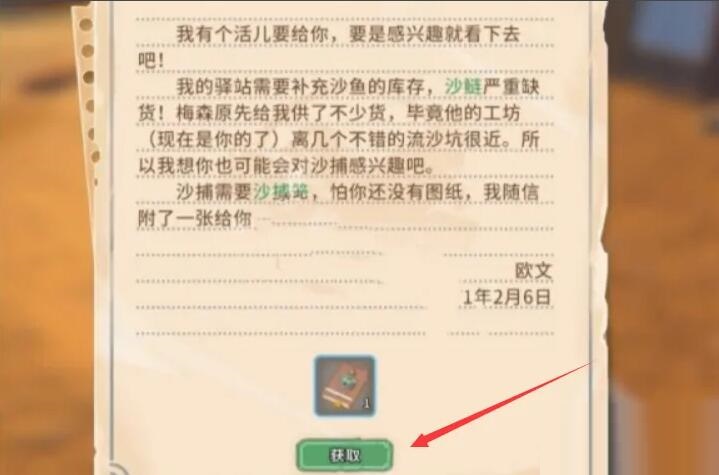 第一步,支线初试沙捕是欧文发来信件拜托帮他捕获沙鲢,随信件会附赠一份沙捕笼的设计图。