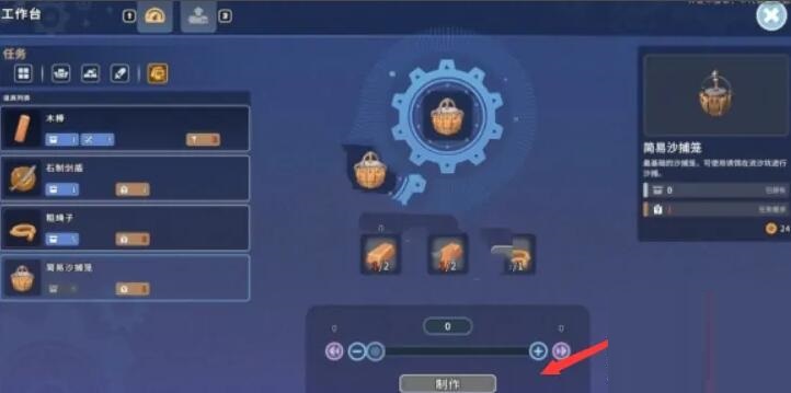 第二步,制作沙捕笼需要使用:铜锭*2、木棒*2和粗绳子*1,将材料收集完毕后在工作台处加工即可。