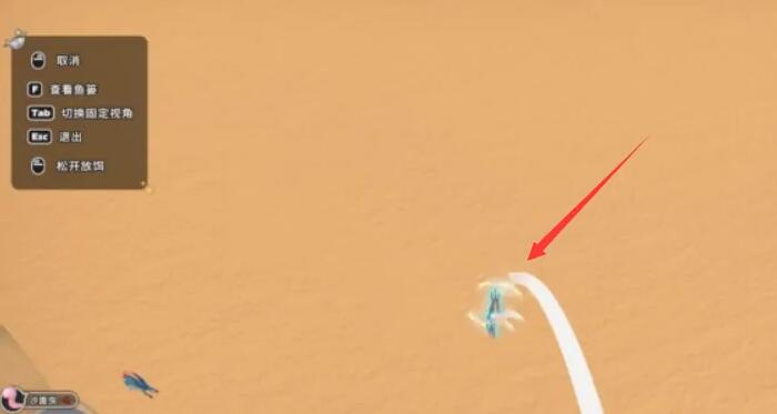 第五步,首先先向沙捕池中扔入一个沙面虫作为诱饵,当沙鲢咬饵后使用沙捕笼瞄准沙鲢,当沙鲢身上出现蓝色高亮后松开左键即可捕获沙鲢。