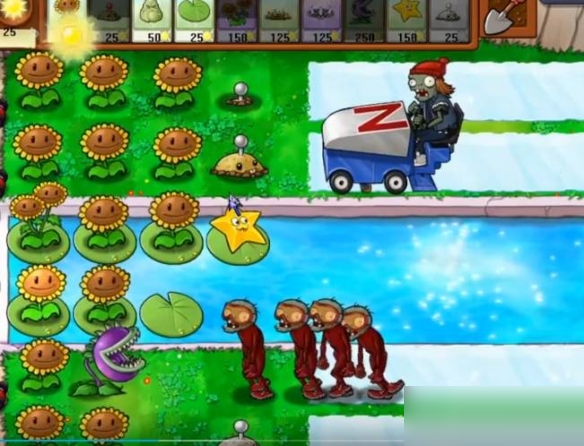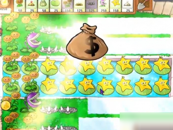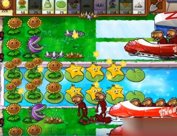 3、继续补向日葵,水里种上杨桃,下方僵尸离近了向日葵就赶紧种上大嘴花。
