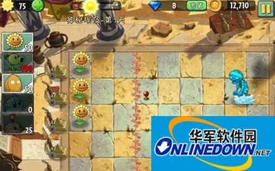 这种类型的关卡,注重的是防御,首先还是一样的,种植向日葵,这里唯一的改变就是在于这里不是建立攻击行而是建立防御行,第二个向日葵建立后,第一个僵尸也就出现了,这里在花线外两格建立一个坚果墙挡住僵尸,然后建立输出植物,等坚果CD一好,就赶紧种植,后期的时候可以移除向日葵,全部种上坚果和输出植物,配合能量豆,应该不是很困难!