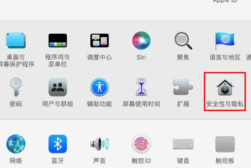 第二步:进入系统偏好设置界面,点击安全性与隐私进入。