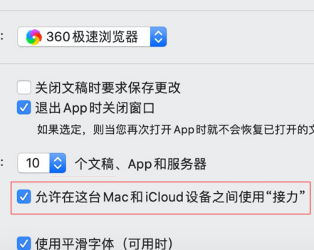 第三步:在通用界面,勾选允许在这台Mac和iCloud设备之间使用接力选项即可。