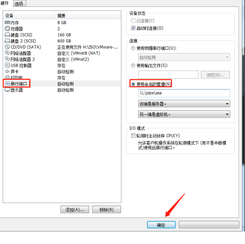 第五步:选择串行端口,点击使用命名的管道,输入管道名,然后确定。
