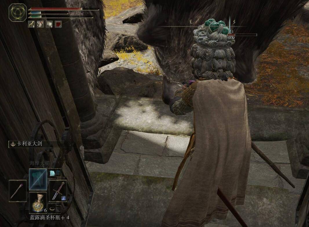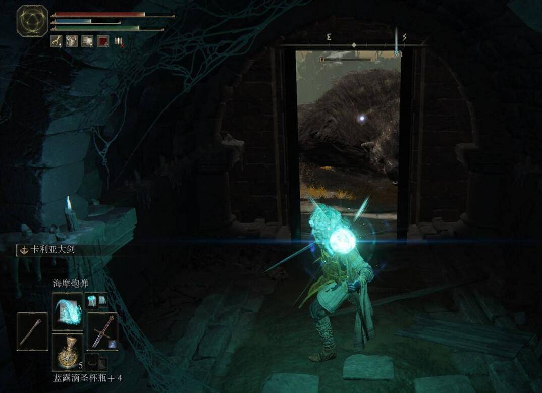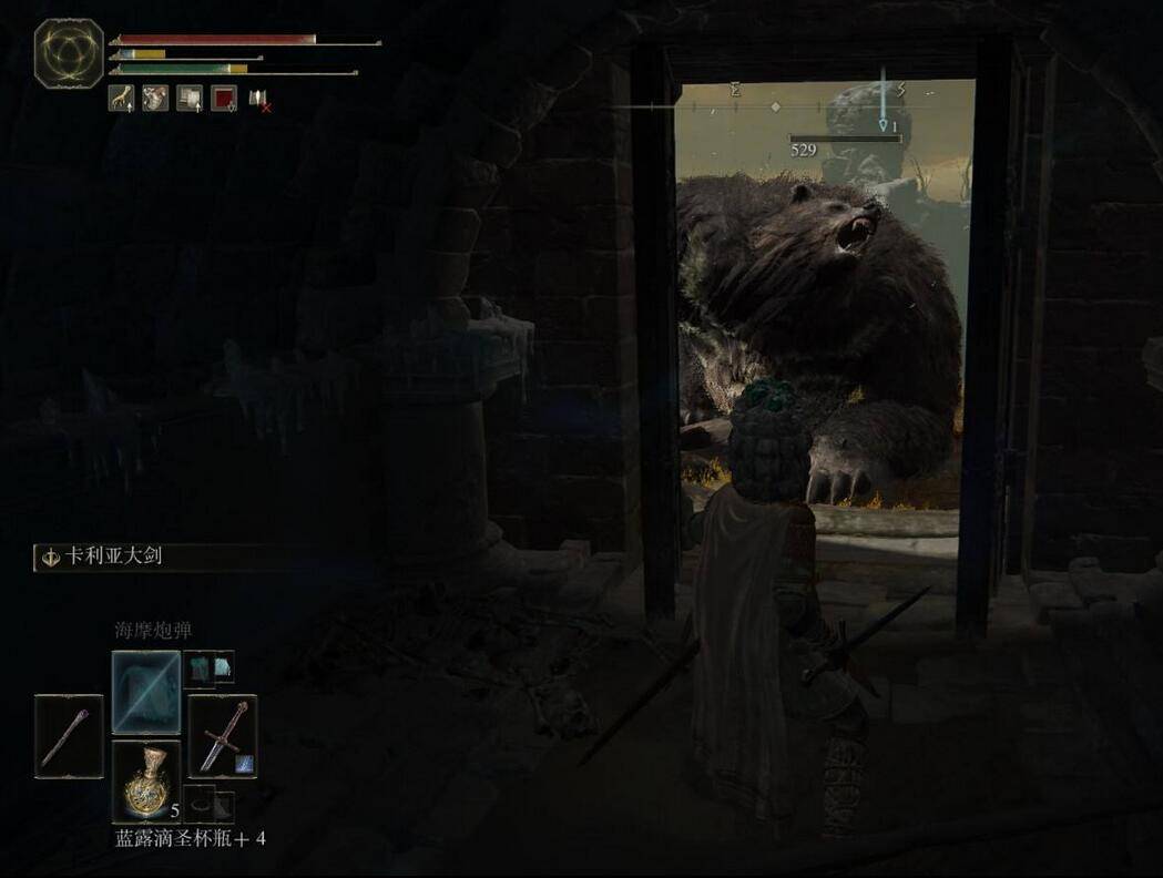 1、在艾尔登法环游戏中,我们要利用攻击吸引巨熊注意力,将巨熊勾引到建筑物门前,阻挡巨熊移动。从而更好地输出。
