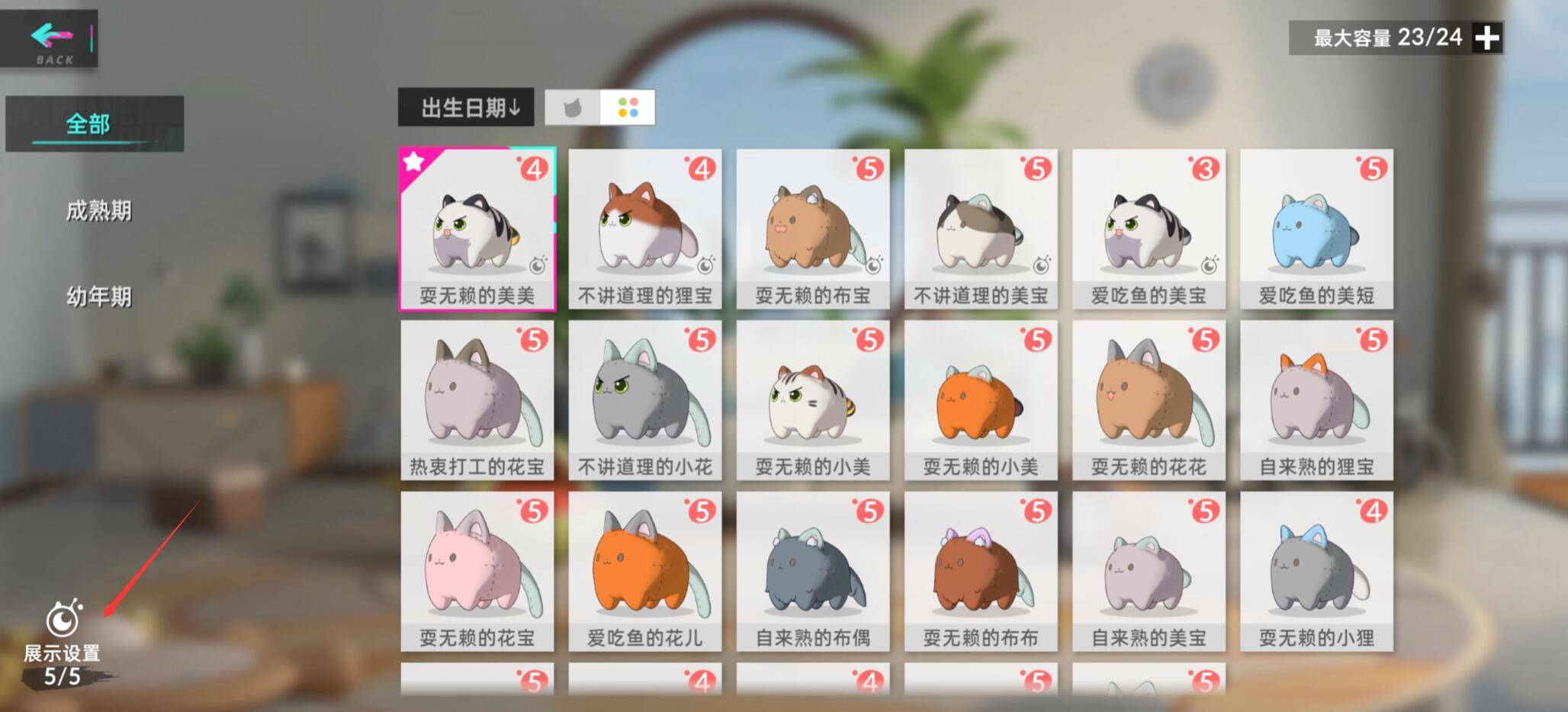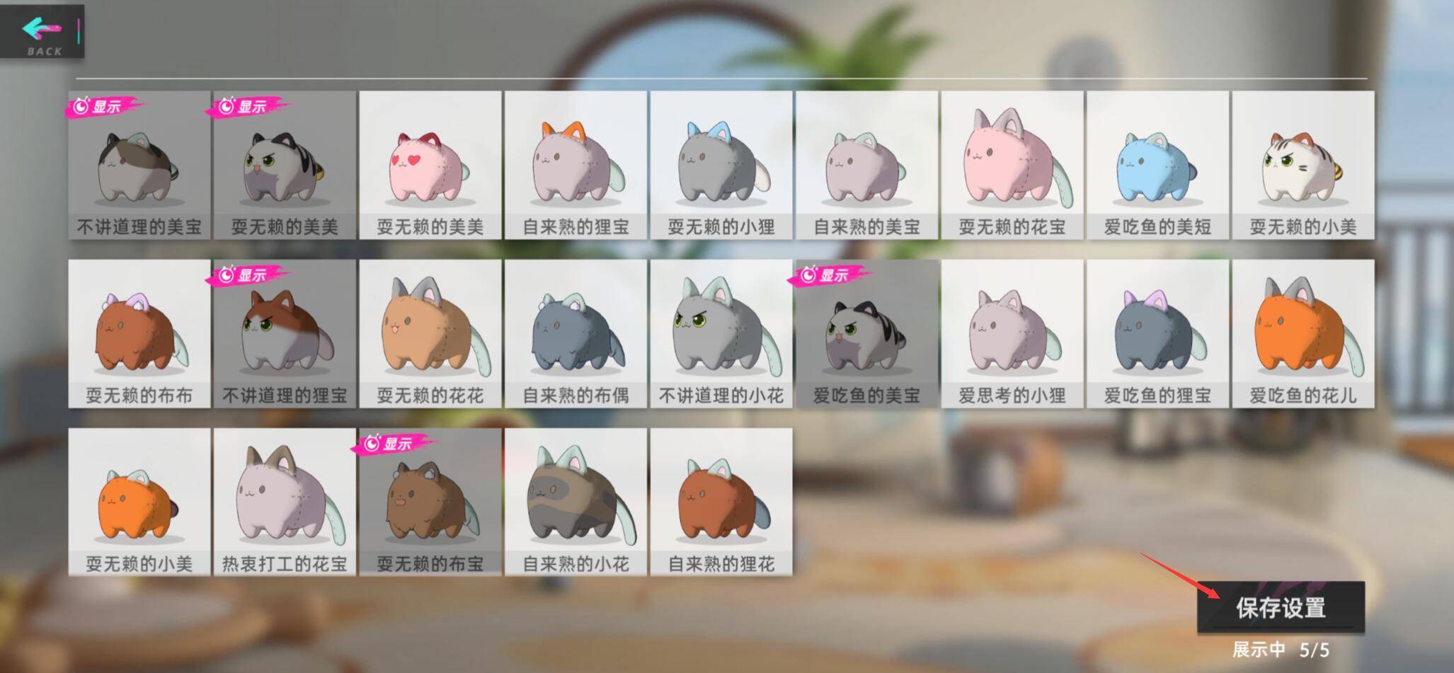 3.接着,在这里可以最多选择5个猫球,点击保存设置,就可以将猫球放在猫屋中了。