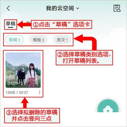第三步:点击“草稿”选项卡;选择草稿类别选项,打开草稿列表;选择拟删除的草稿并点击竖向三点。