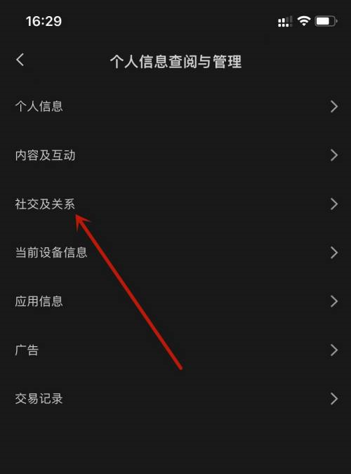 第二步:在个人信息查阅与管理中,点击社交及关系。