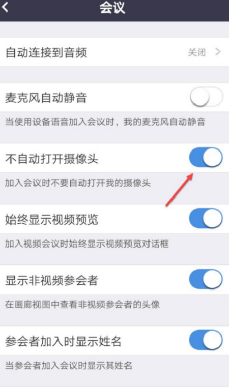 第四步:进入会议界面,找到不自动打开摄像头,拖动滑块。
